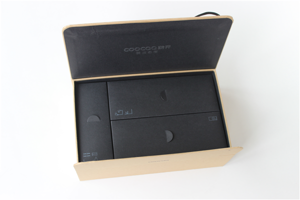 盒多數(shù)牛皮紙包裝一樣,這款包裝并沒有印刷太多的圖案,只是在皮殼上印有創(chuàng)維酷開的logo圖案,單色印刷簡(jiǎn)潔素雅,十分大方。
