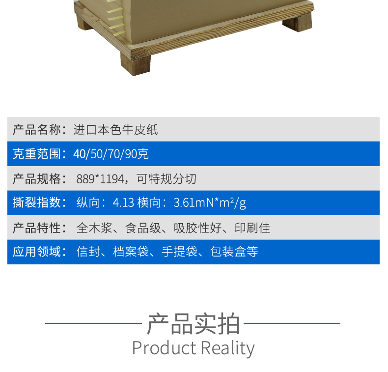 【克重范圍】: 40/50/70/90克 【產品規格】: 889*1194,可特規分切 【撕裂指數】: 縱向:4.13 橫向:3.61mN*m2/g 【產品特性】: 全木漿、食品級、吸膠性好、印刷佳 【應用領域】: 信封、檔案袋、手提袋、包裝盒等
