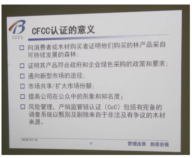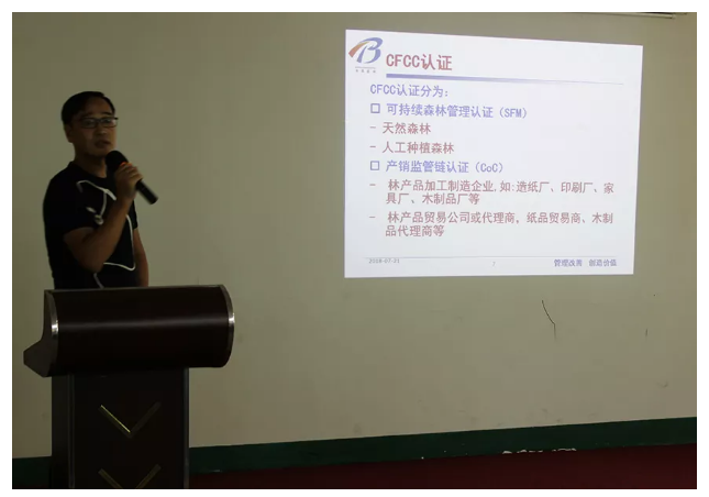 伽立實業(yè)集團邀請來自專業(yè)機構的培訓講師,任職PEFC和CFCC認證相關崗位長達數(shù)十年經(jīng)驗,對營銷中心及相關部門進行PEFC和CFCC認證培訓指導。
