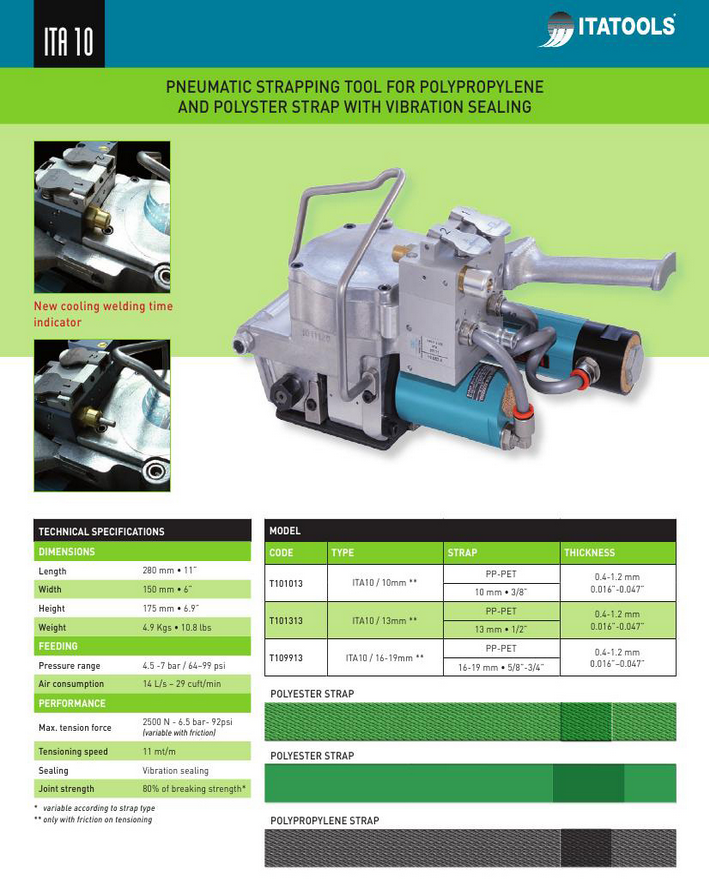ITA 11 是適用於中拉力需求的PP、PET帶氣動打包機,針對所適用的打包帶共有13mm以及16 ~ 19mm兩種機種可以選擇,束緊力達3,500N,拉帶