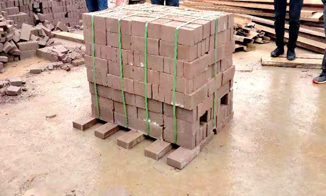 在打包過程中,先放置托盤,再逐層放置磚塊,這里的托盤主要起的是一個(gè)固定作用,在免燒磚打包中有利于晾干,當(dāng)磚廠沒有托盤時(shí),可在底部擺置與托盤空隙相仿的便于碼垛的“打包架”,只是在逐層碼垛的過程中留兩個(gè)叉車孔,便于運(yùn)輸,并不會(huì)對(duì)底部的紅磚產(chǎn)生過大的壓壓制力,更不會(huì)發(fā)生壓壞現(xiàn)象。